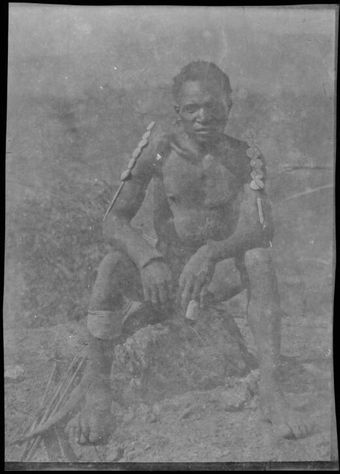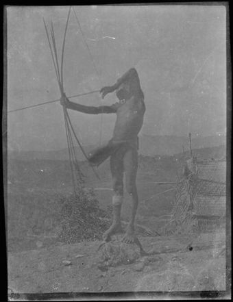 Man standing on a stone holding a bow and arrow, Papua, ca. 1923 / Sarah Chinnery