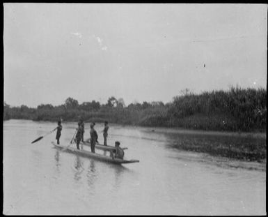 Two canoes of standing paddlers, Ramu River, New Guinea, 1935 / Sarah Chinnery