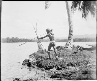 Ramu man aiming bow and arrow into river with a dog at his feet, Ramu River [?], New Guinea, 1935 / Sarah Chinnery