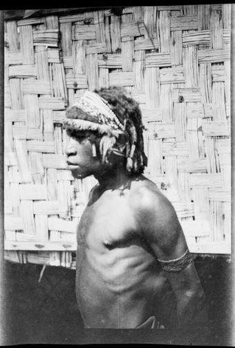 Man standing in front of a building, Ramu River, New Guinea, 1935 / Sarah Chinnery