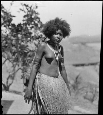 Woman wearing a grass skirt and a bilum, Papua, ca. 1923 / Sarah Chinnery