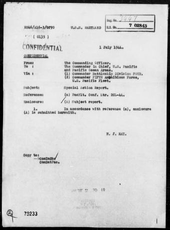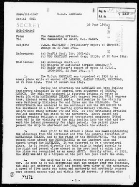 USS MARYLAND - Preliminary Rep of Torpedo Damage on 6/22/44 While Anchored off Garapan, Saipan Is, Marianas
