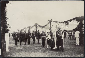 King George and party outside palace during Charles Houghton Mill's visit to Nukualofa, Tonga
