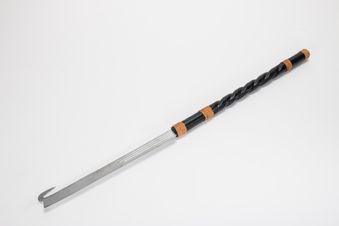 - Lightly coloured, wooden club. 19 teeth present down one side of the blade, 5 of which have missing tip. 6 bands of opposing triangle patterns with a lime filling. Grip has slight patina. Large hook at the proximal end.