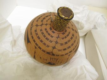 - Three lime gourds. .1: bottle-shaped gourd, orange with surface pattern of lines and curves. .2: as before, smaller
