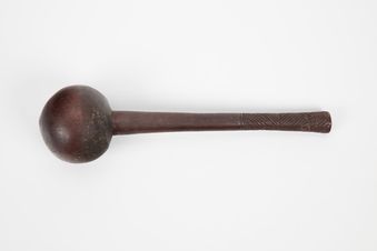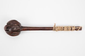 - i Ula. Throwing club. i Ula are carved from the rootstock of a hardwood tree. It is intended as a weapon that can be gripped in the hand or thrown in short range distances at assailants. This i Ula consists of a bulbous ball-shaped head and long, slender adjoining handle. The head is round and smooth and carved to a slight peak at its top centre. A fine crack is visible on the underside of the head as well as at its peak. Three notches at th...