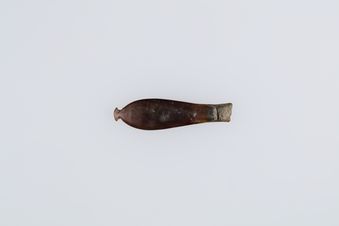 - Shank, fish hook. Component for fishing hook. Cut from yellow parau (mother of pearl shell) in a long narrow strip so as to include a part of the hinge (to form the thicker proximal end) as well as the area towards the lip of the shell (at thinner end). Sides of the parau shank have been ground down smooth and polished to achieve desired colour and size. Grooves cut into the shank at thinner end for lashing. One hole drilled at thickest part o...
