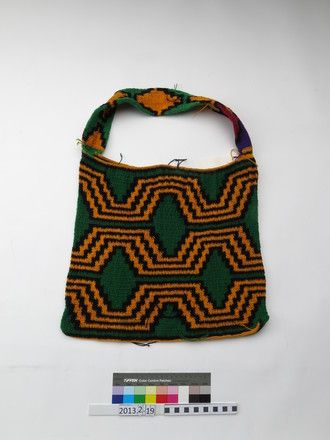 - bag made of natural local string, with some strands dyed different shades of brown to form patterning. Two rows of Cuscus fur woven in also. "B14" written on white tag in black ink, "wale tapi" typed on brown tag and "No 14" also written on brown tag in blue ink.
