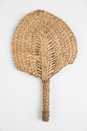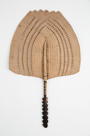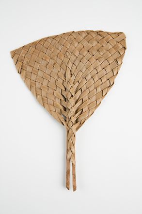 - Iri. Fan. Woven from drau ni niu (coconut leaflet) and sasa (midrib) of natural colour, with a wooden handle lashed with dyed-black magimagi (sennit). Commencement from base of blade and woven out in a horizontal twill altering to a vertical twill to complete the blade. Blade is in the shape of a spade, and three pointed. One point is damaged. Bottom corner of blade is also damaged. Finely braided dyed-black magimagi lashed at base of blade.