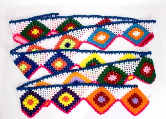 - These three fafetu works are made of plastic cargo ties, which are wrapped in different coloured ribbons and plastic. The spaces are decorated with a variety of patterns in wool of varying colours using the technique of tio - a type of crochet work, and lalanga - weaving using a needle. Small cowrie shells decorating the edges of the outside circular and star shaped frames finish off the work. The bright and colourful palette is a distinctive ...