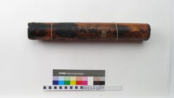 - gourd container with cane binding. Rolled fibre carrying cord attached. For storing tree oil; complete