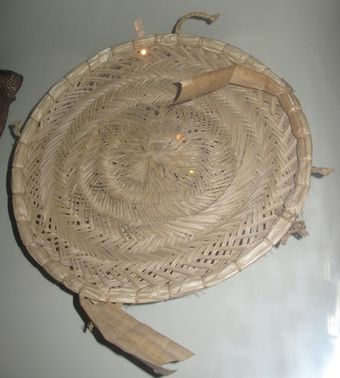 - Sovasova. Implement carved from kau (wood) into an oval scoop with a handle. A golden coloured cord of magimagi (coconut sennit) threaded through handle. Lightweight. Patina in the interior of the scoop. Brown in colour.