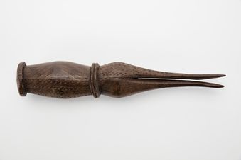 - i Cula ni Bokola. Carved from solid kau (wood) into a form consisting of four prongs and a handle. The handle is diamond in shape, with a groove and a band of square shaped incisions around and near the centre of the handle. Prongs taper from the base. Brown in colour and some surface patina.