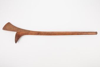 - i Wau Sali. War club. This i Wau Sali is carved from kau (wood) into a spurred head and long curved shaft and capped butt. A central ridge is carved on the top surface of the head and a smaller ridge in between the spur and the head. Decorative carving in light relief on the underside of the head in a pattern of small circular nodes in series, and at the grip end in tavatava (zigzag) design. The i Wau Sali is dark brown in colour. This Label a...