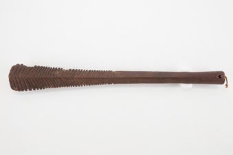 - 'Uatogi. Ribbed club. This 'uatogi is carved from one piece of toa (iron wood). This 'uatogi is dark brown in colour with a smooth surface. The handle of this 'uatogi is four-sided with no decorative features. At the base of the handle is a triangular protrusion that has been drilled with a small suspension hole. The handle then widens to a flat blade with four sides and diamond cross-section. Decorating the blade is six bands made of individu...