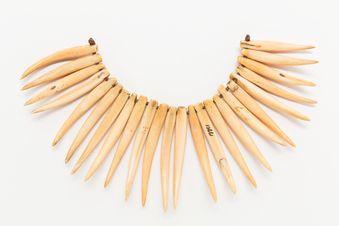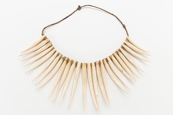 - Wasekaseka. Whale tooth necklace. Consisting of twenty-six whale teeth, milky white/ivory in colour. The teeth are long, narrow, curved in shape, with pointed ends, bored at their bases and threaded onto a cord woven from magimagi fibre (coconut). The ends of the cord are knotted together. The cord is criss crossed over the back of the teeth to hold them in place. There are cracks and splits on a few of the teeth.