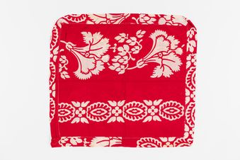 - Auaro. Pillow slip. Rectangular shape. Matches tivaevae 55855 (ethnology number) and pillow slip 55858 (ethnology number) as a complete set. Pillow slip sewn from cotton fabric of royal blue with multi-coloured applique design sewn by hand on one side. Design of materita (chrysanthemum) flowers and green leaves. Two red materita with white tataura (embroidery), one yellow materita with pink tataura. Pillow slip has white eyelet borders along s...