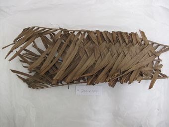 - Warp fibres left to form fringe at both ends. Six slim bands of black zigzag elements across width of mat at intervals. At each end of these sections of fibre added to form tassels.