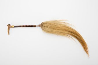 - i Roi. Fly whisk. Made from composite materials. The i Roi consists of a long cylindrical liga ni i roi (handle) carved from kau (wood) that widens toward the butt, with a whisk of magimagi (coconut sennit) of straight strands and thick volume, light brown in colour attached to the top end of the liga ni i roi. The sennit is attached with cord wrapped around the kau to secure the sinnet. The liga ni i roi is brown in colour.