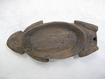 - wooden food dish. round shape. unstable. carved zigzag around outside circumference. slight traces of white cement. Stand with same number found with bowl.