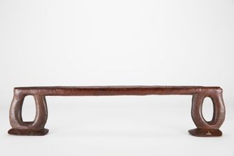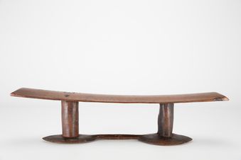 - Kali. Headrest. A kali carved from solid kau (wood) consisting of a long rest that slightly curves inwards, widening at ends which turn down to become supports. Each support 'leg' is convex and thicker than the rest, with rectangular 'feet' at their base that are chipped, with significant damage on one. Dark brown in colour. Numerous scratches on the surface of the rest.