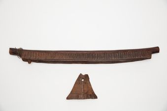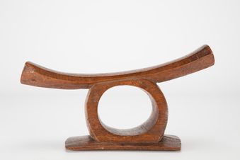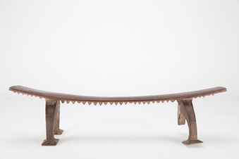 Kali. Headrest. A carved from kau (wood), consisting of a wide rectangular rest, slightly flared towards each end. A strengthening bar carved along the length of the underside of the rest. The rest is supported by two yava ni kali (support legs) of a stepped, quadrangular shape that each sit on an oval base or 'foot' of kau. Dark brown colour. Some fine scratching and wear on the surface of the kali."VE" and "USAIA" incised on the underside of...