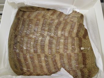 - Basket; natural background, finely woven basket with design in rust red; top of basket has fibre threaded through; three rust and natural tassles;