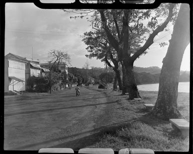 Road scene, Papeete, Tahiti, showing man on bicycle, buildings and trees