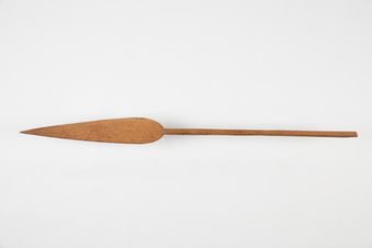 - Foe. Paddle. Carved from a single piece of rakau nu (coconut tree wood). Rapa (blade) has rough edges, and is pointed with a lug at the tip of blade. The butt-end of the kakau (handle) is flat. The junction between the handle and the blade is decorated with indentations, diamond and circular shaped mother of pearl shells. Two diamond shaped shells are missing. There are light coloured markings visible on kakau (handle) near base of blade. Brow...