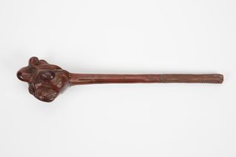 - i Ula. Throwing club. i Ula are carved from the rootstock of a hardwood tree. It is intended as a weapon that can be gripped in the hand or thrown in short range distances at assailants. This i Ula consists of an unevenly lobed head and long slender adjoining handle. The head is carved into nine lobes arranged concentrically with a central flanged dome. Fine cracking is visible between lobes. The handle tapers from the underside of the head, c...