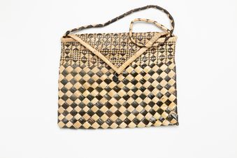 - This is a Taimani (diamond) shaped open top handwoven Taimani (Diamond), Fakahilihili (drawn over three strands) and Manulua (very old Tongan design), patterned kato (bag). The inside layer is tofua that measures 25mm x 25mm. This is a double skinned woven kato of tofua (natural pandanus) and possibly paongo (brown pandanus) dyed black, at the bottom tip they measure 30mm x 30mm down the right edge before being split into 5mm lengths and is wo...