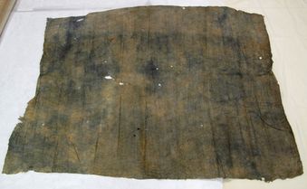 - Sheet of barkcloth, ruled grid of 4 x 5 rectangles, alternate box is stencil and freehand decorated while other box is wood block printed with central dark circle.