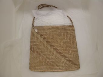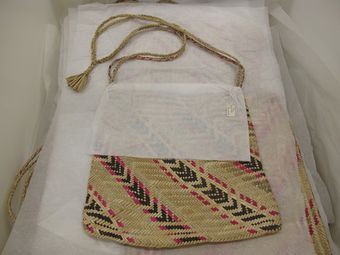 - Basket, natural colour fibre, four handles, diagonal stripes of bright pink and black