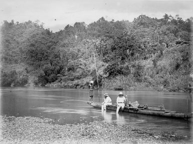 - One Fijian man stands, and two European men sit, on a canoe at the edge of the river. The Fijian man holds a pole for propelling the canoe, and one of the European men holds a gun. On the far side of the river the bank rises steeply to hilly country covered with forest. Quantity: 1 b&w copy negative(s).