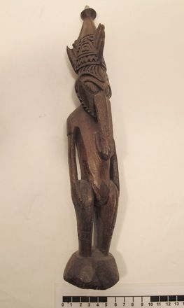 - This large figure was carved from wood. It is decorated with paint. This figure represents a male ancestor.