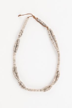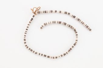 - Te mwae teimoone. This strand of shell currency consists of small pieces of white te nouo (conus shell) and dark brown te nana (coconut shell) ground into small discs drilled at their centre and strung in an alternating monochrome pattern on a length of medium brown cord of te kora (coconut sennit), tied off into a neck ornament. The disc pieces are 8mm in diameter.