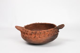 - A deep clay pot with a rounded base, a narrowing at the neck, an angular point to the belly and a short fluted rim. There are mouldings on the exterior, vertical lines projecting towards the rim. The angular belly is banded with mouldings that appear as projecting serrations. There are no handles and no suspension holes. There is a black patina on the round base that could be from the initial firing of the vessel or from subsequent use.