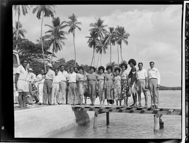 Group on the wharf at Malan Anchorage, Vanua Levu, Fiji