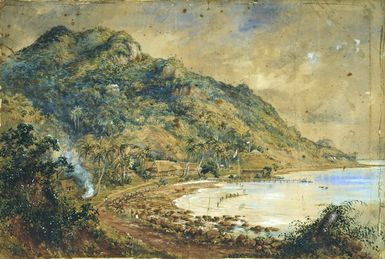 - Shows a coastal settlement in a bay on Fiji in 1876, with vegetation, buildings, village life. A bonfire is burning on the beach, and people are involved in fishing. A British flag flies on a pole near a jetty, and several dwellings and buildings arranged along the shore, amongst tropical palms and other vegetation, which extends up the steep hill behind the settlement. The sea extends into th...
