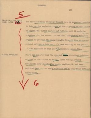 - Script from the WBAP-TV/NBC station in Fort Worth, Texas, relating a news story about the united nations security council who met in emergency session to take up the explosive issue of the fighting on the island of Cyprus. [1] p. ; 28 cm. Papua New Guinea - New Britain Island