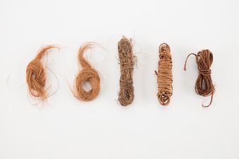 - fine mat with top and lower edge locked off, then strands left to form fringe, lower edge has additional triangular pandanus leaf fringe and double (end on end) row of red feathers all sewn on. Two vertical bands of red feathers at both ends of lower edge.