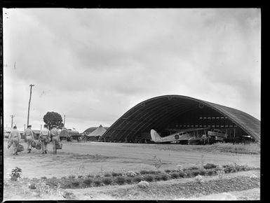 Bi-planes under a hangar with unidentified soldiers walking by, Nausori Airfield, Fiji