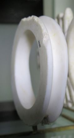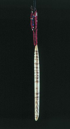 - beaded belt; trade beads of green and white horizontal stripes; dogs teeth set vertically in between vertical column of red beads; horizontal stripes of yellow and red beads at intervals; dogs teeth are incised with triangular patterns highlighted in black;
