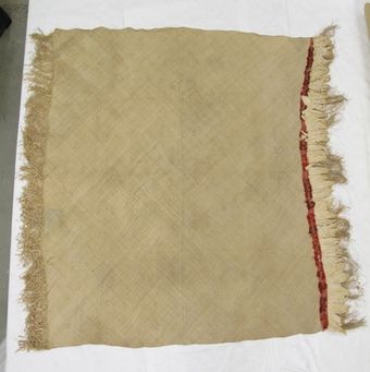 - mat, fine. Plaited pandanus. finely woven pandanus fringe ornamented with red feathers. These mats form the marriage portion of the women. Purchased from Seu mana tafa, Chief of Apia.