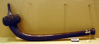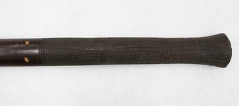 - winged war club. broad flat blade with round end. shaft rear head has lenticular cross section which becomes round. large uncarved pommel. all else apart from bar carved in zigzag which is incomplete. blackish colour with red tinges.