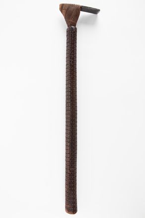 - Ruatangaeo. Hafted adze. Consists of carved rakau (wooden) handle and toki (stone adze blade). Toki (adze - triangular in cross section) of toka kerekere (basalt stone) lashed with braided puru akari (coconut sennit) in an iri taki toru (3-ply braid) technique to a carved rakau haft. Haft carved in a solid cylindrical shape towards the top of the haft, and carved in a cube at the base. Carved surface decoration applied to the entirety of the r...