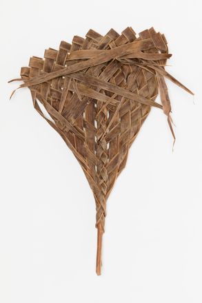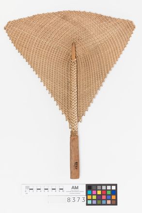 - Tairiiri. Fan. Composite tairiiri woven from rito (young coconut leaf) with dyed-red kiriau (hibiscus fibre) akaververe (fringe), attached to mauranga (handle) rakau (wooden). The blade is in shape of an inverted triangle. Plaited commencement at centre base of the blade. Woven out in vertical twill (4/1) from the centre to form lower edge and sides of blade. Weaving technique alters to three rows of horizonzal twill to complete the rest of th...