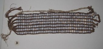 - Head band of babmoo leaf. Rolled fibre cord at both ends. Decoration burned into surface of leaf.
