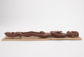 - carving, wood, human figures with bird and other decorative tracery, has red and white paint