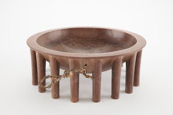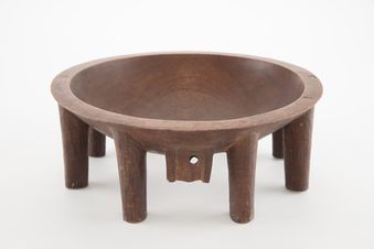 - Kava Bowl. Carved from wood. Used for kava in ceremonial occasions. Shows surface wear as well as adze working marks. Round shape. Two spouts at opposite of the bowl. Four legs, one missing. Coconut sennit cord attached. Brown colour.